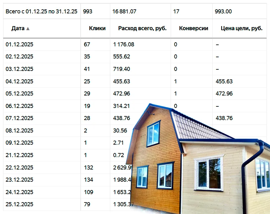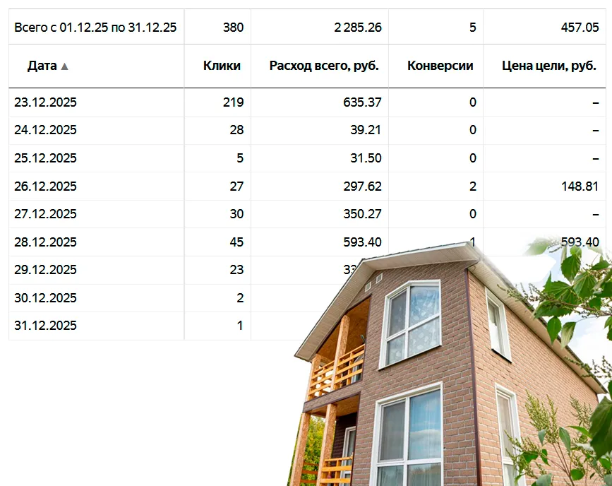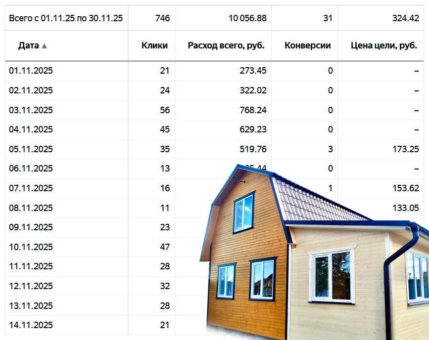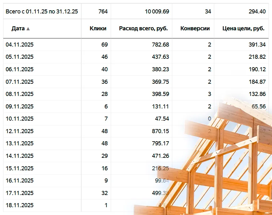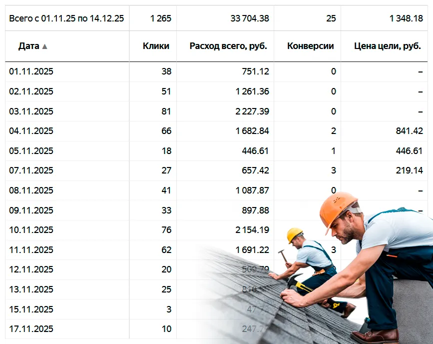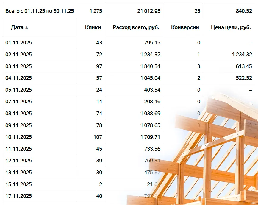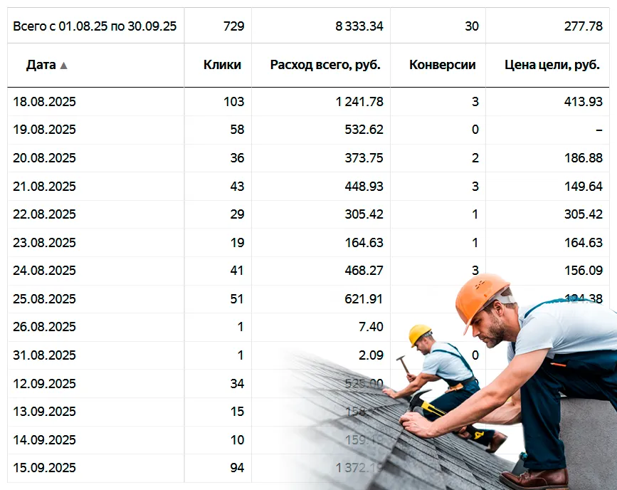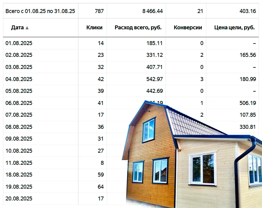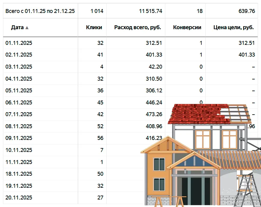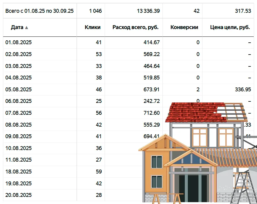 95% рекламы и продвижения провожу в Московской области (самая высокая конкуренция) по направлениям: кровельные работы, пристройки и веранды, реконструкция старых деревянных домов, фасадные работы, фундаменты, строительство каменных и каркасных домов и др.